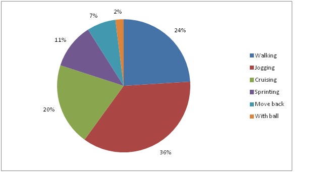 One of the early researches about motion analysis in football was from Reilly and Thomas (1976). They found that the overall distance covered by outfield player during a match consists of 24% walking, 36% jogging, 20% cruising, 11% sprinting, 7% moving backwards and 2% moving in possession of the ball. The below figure visualises the above finding.
